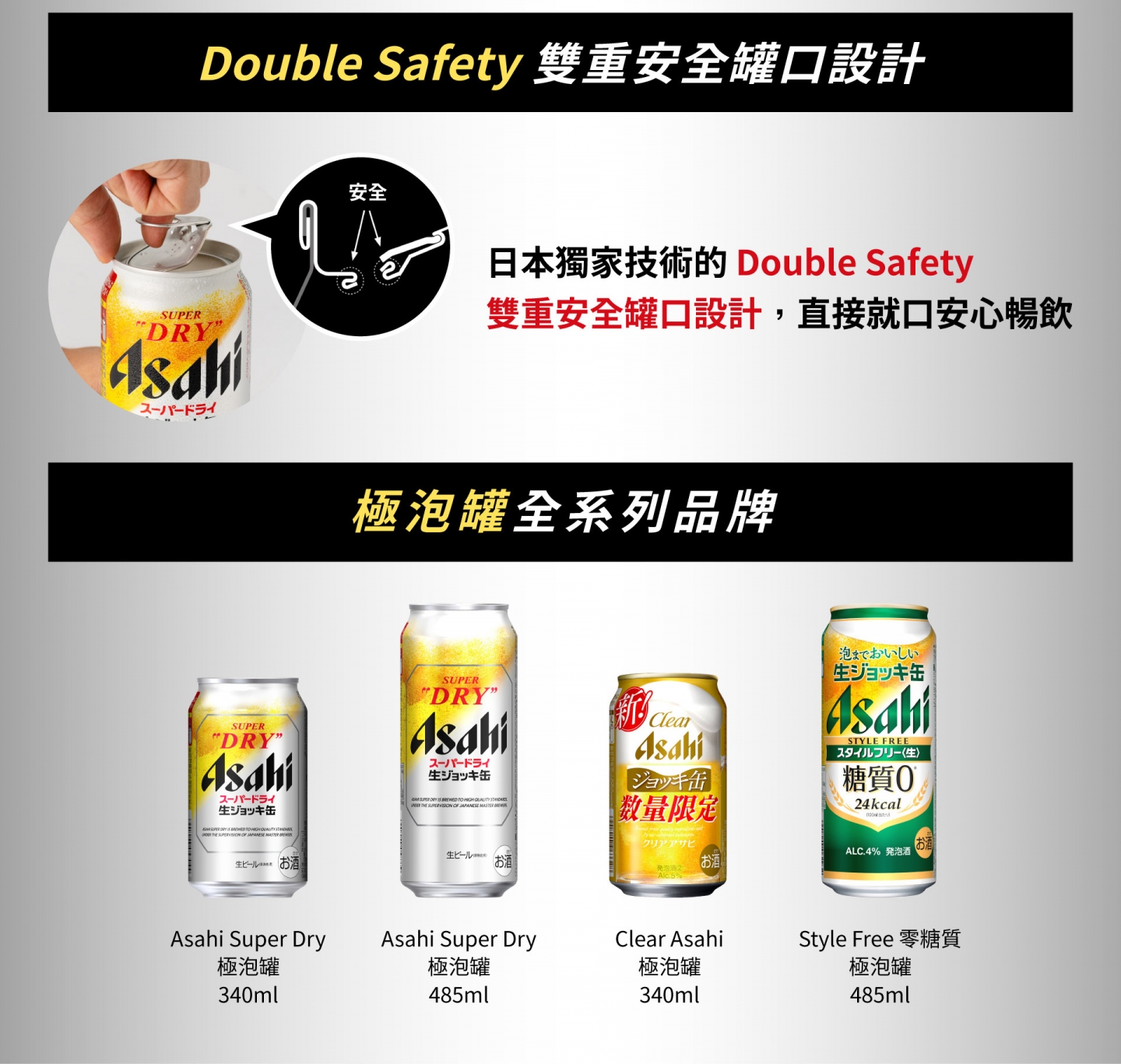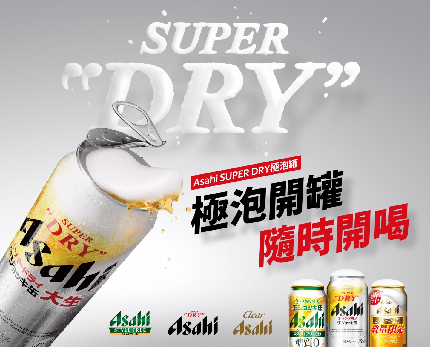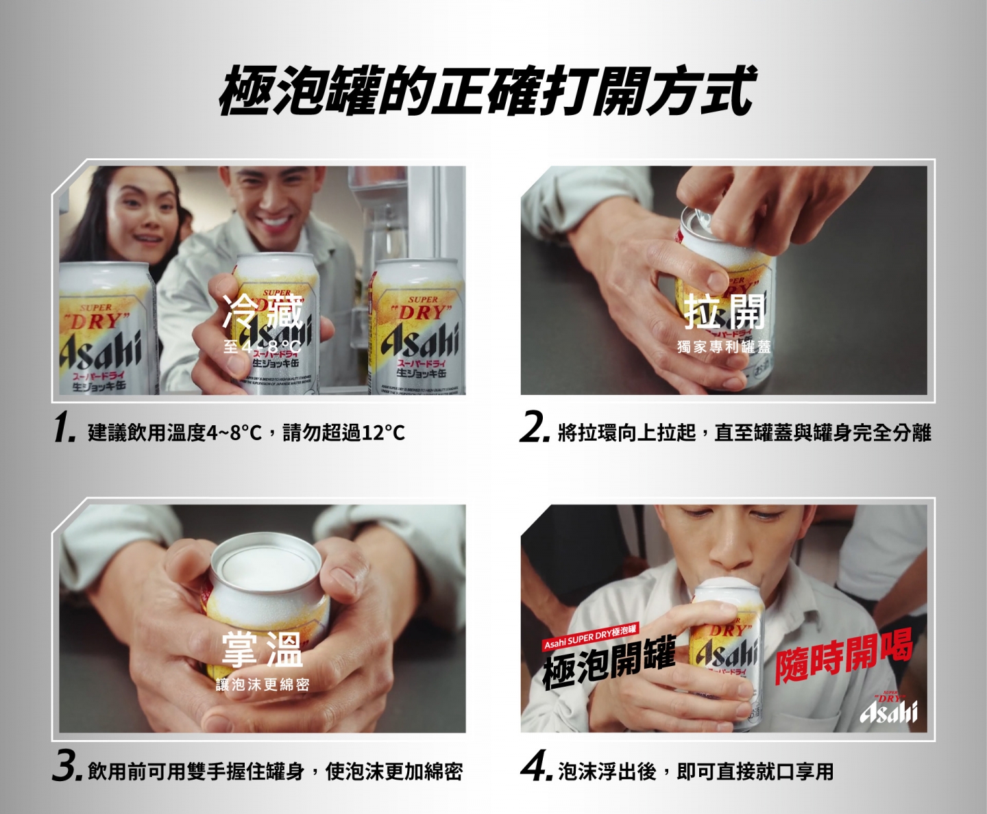 Asahi Super Dry 極泡罐為日本熱銷話題啤酒「Asahi Super Dry生ジョッキ缶」的國際限定版,使用獨家特殊專利塗層與Double Safety雙重安全罐口設計,罐內的專利塗層讓啤酒在開蓋的瞬間產生如生啤般綿密細緻的泡沫,雙重安全的全開式罐口設計,更便於直接就口暢飲,徹底改變你對罐裝啤酒的想像。